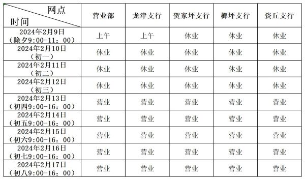 根据国家法定节假日安排,结合我行实际情况,现将2024年春节期间放假、营业安排通知如下: