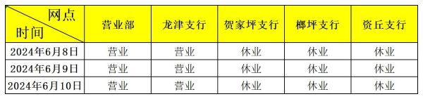 根据《国务院办公厅关于2024年节假日安排的通知》精神,结合我行实际,现将 端午节期间各网点营业时间公告如下: