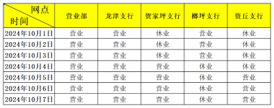 根据《国务院办公厅关于2024年节假日安排的通知》精神,结合我行实际,现将国庆节期间各网点营业时间公告如下: