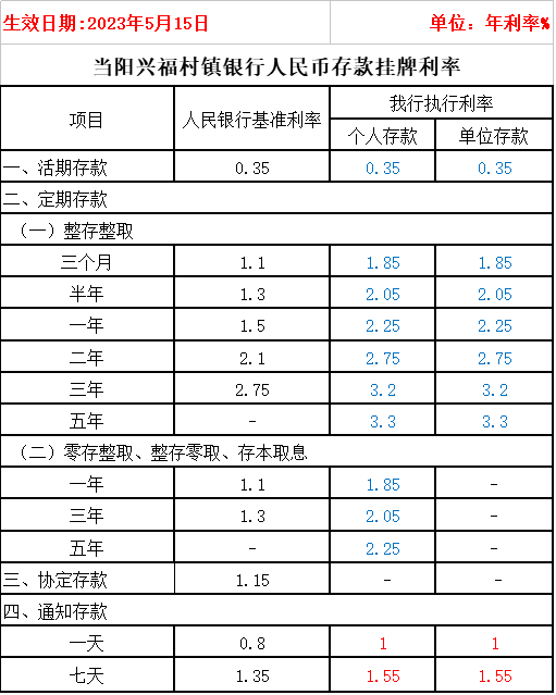 您好,当阳兴福村镇银行自2023年5月15日起,调整人民币个人通知存款挂牌利率,调整后的利率表详见下表: