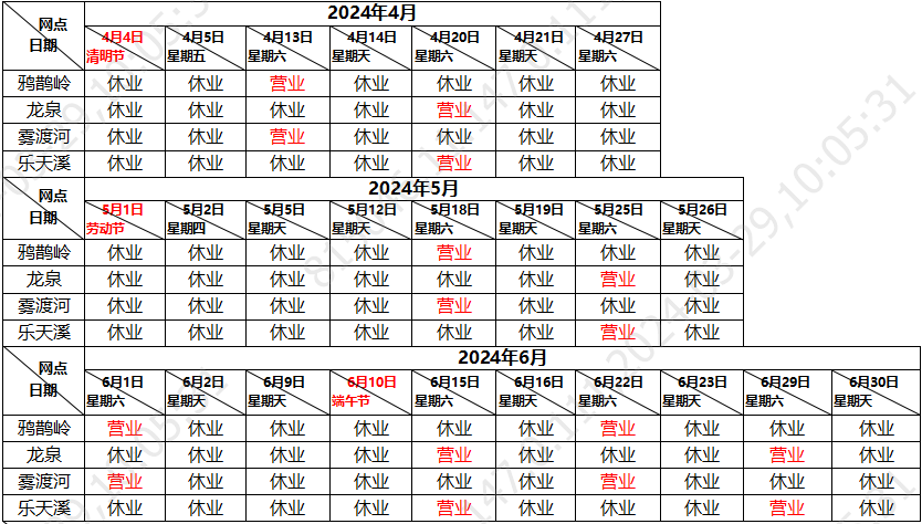 根据《中华人民共和国劳动法》及中国银行业协会《关于加强商业银行节假日金融服务的指导意见》的要求,经报备监管部门,我行乡镇网点(具体网点如下)2024年4月1日起实行轮休制度,营业网点相关公告如下: