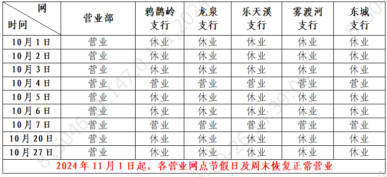 根据《中华人民共和国劳动法》及中国银行业协会《关于加强商业银行节假日金融服务的指导意见》的要求,现将各支行网点国庆节及四季度休业安排公告如下: