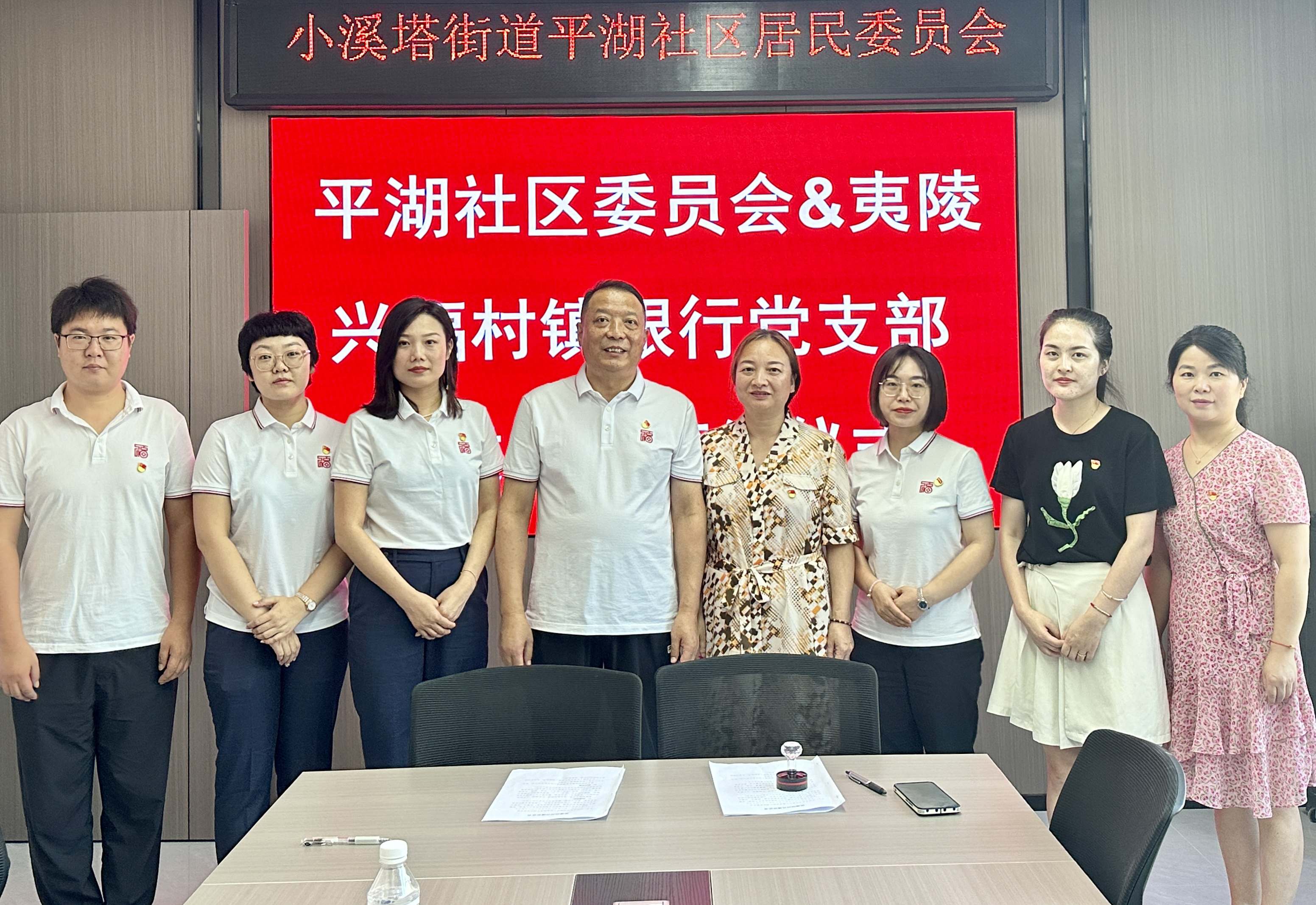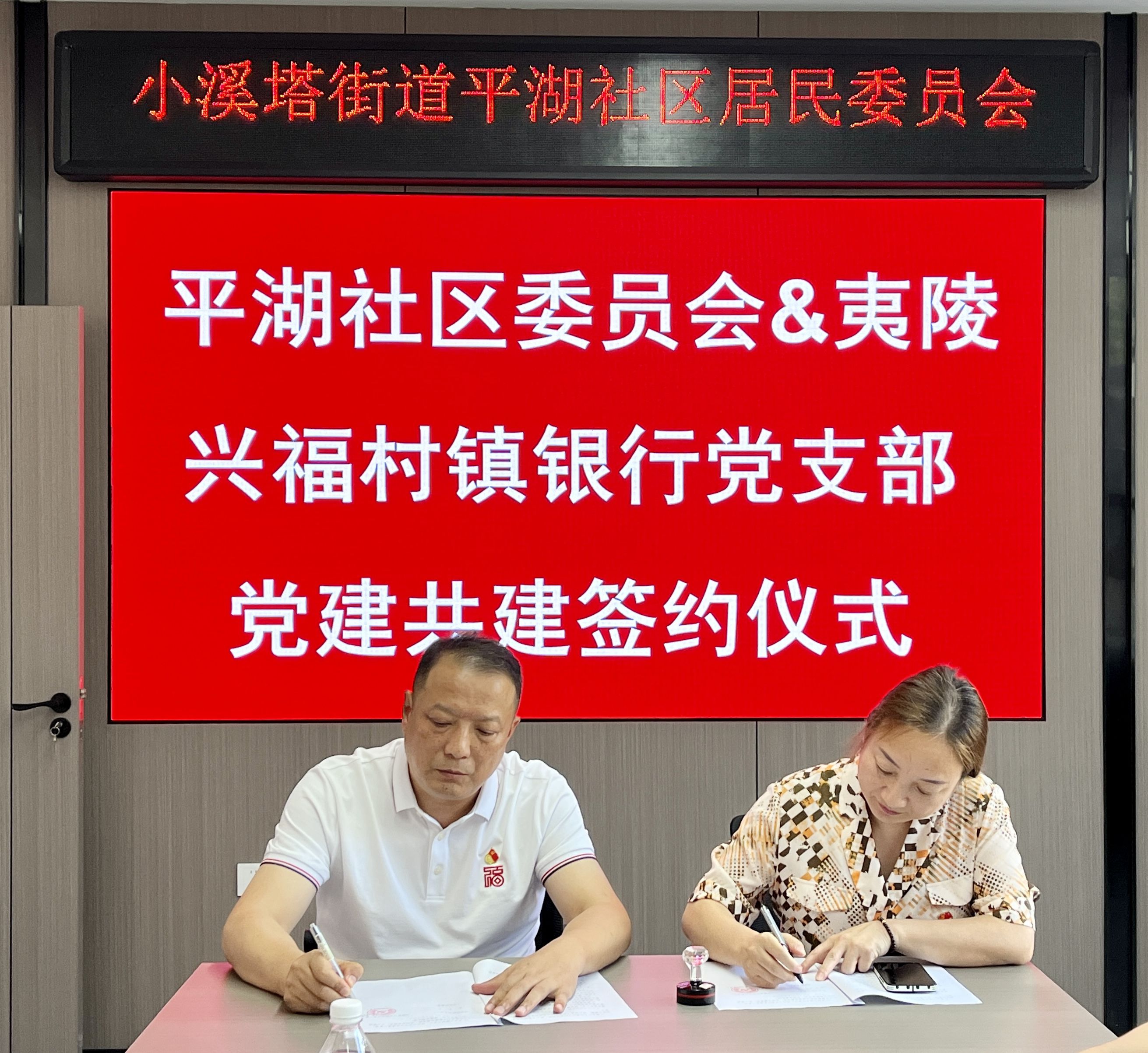 为充分发挥党建引领作用,推动基层党建和金融服务有机融合。2023年8月15日,夷陵党支部与小溪塔街道平湖社区委员会举行了党建共建签约仪式。社区是联系群众、服务群众的“最后一公里”,是社区治理的着力点,让便民服务真正“零距离”触达。会上,双方针对实践活动、志愿服务、结对帮扶等沟通交流,并签订了《党建结对共建协议书》。双方立至在帮助老百姓实现在家门口充分享受金融便民服务的同时,主动参与社区治理,真正实现让银行立足地方、扎根网络。