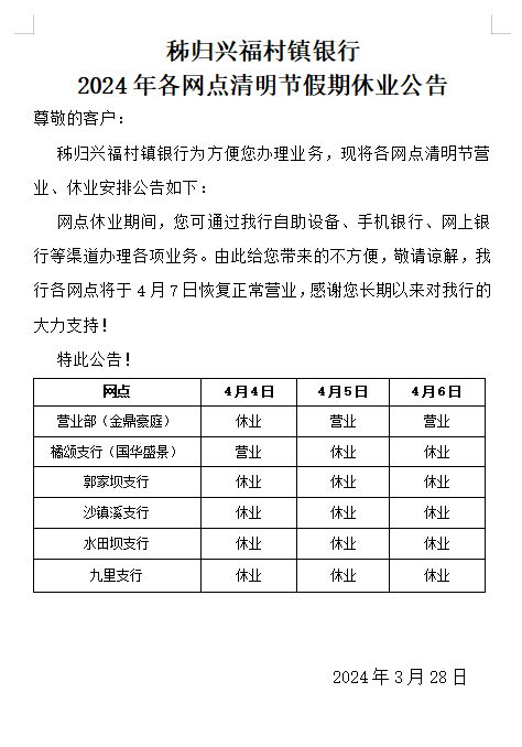 秭归兴福村镇银行关于清明节期间各网点营业安排