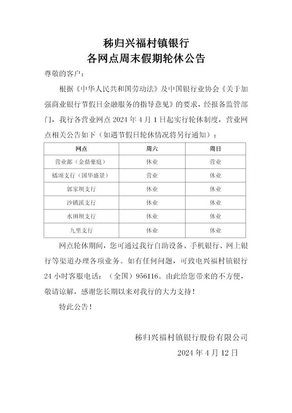 2024年秭归兴福村镇银行各网点营业安排周末假期休业情况