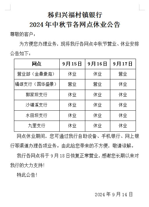 秭归兴福村镇银行2024年中秋节各网点休业公告