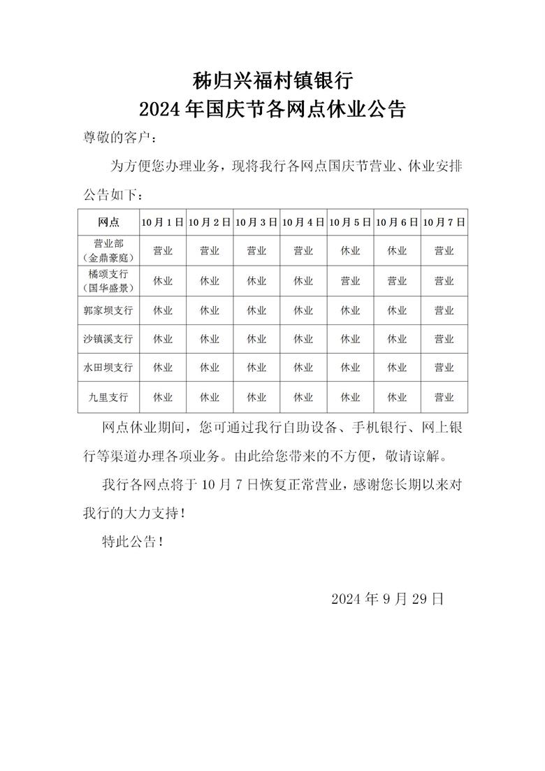 秭归兴福村镇银行2024年国庆节各网点休业公告