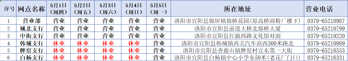 宜阳兴福村镇银行关于劳动节期间网点营业时间的公告