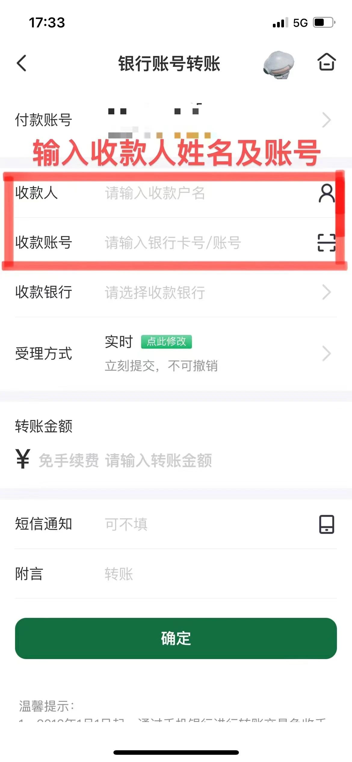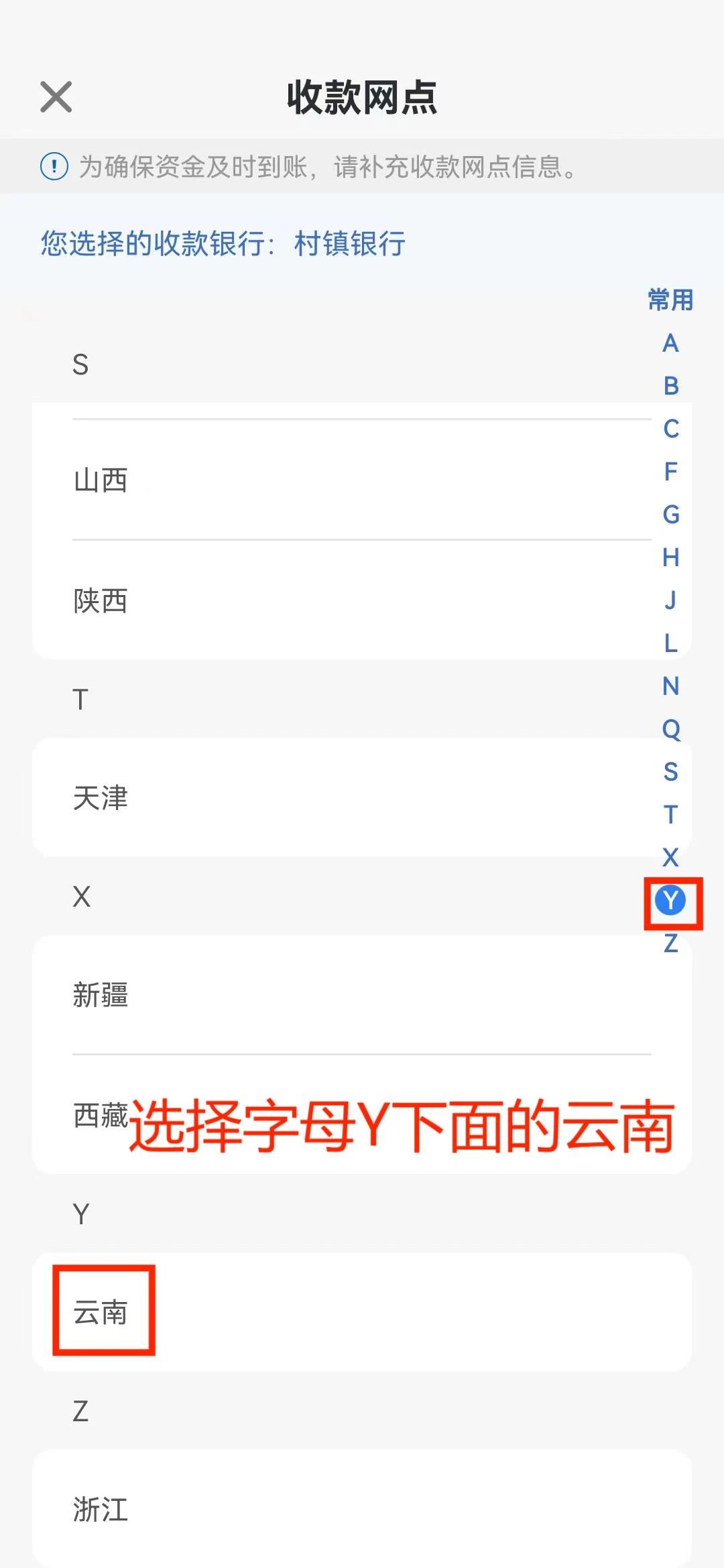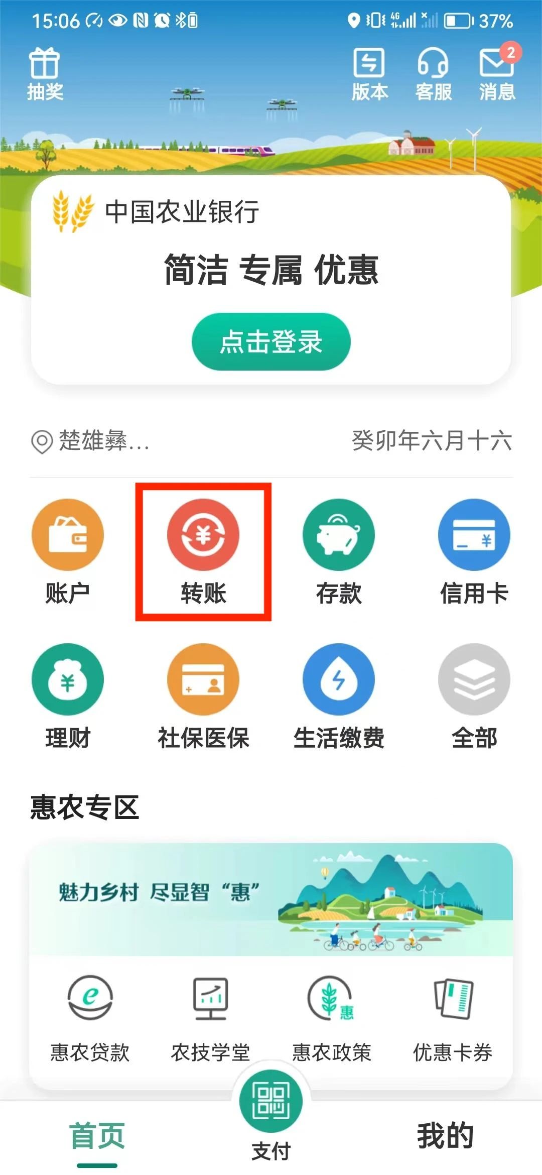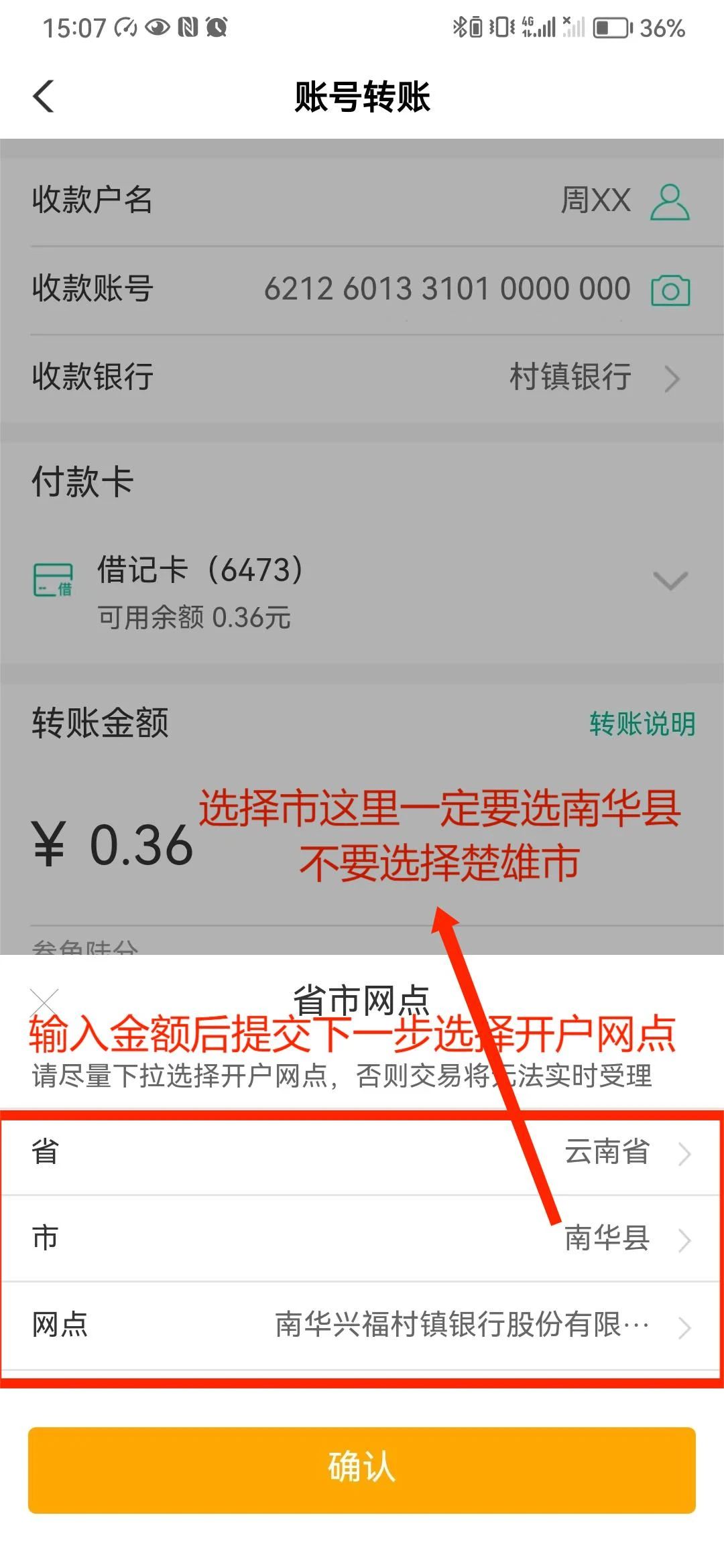 农业银行手机银行→转账→填写转账信息→选择收款银行→村镇银行→选择云南省南华县→南华兴福村镇银行股份有限公司→完成转账。