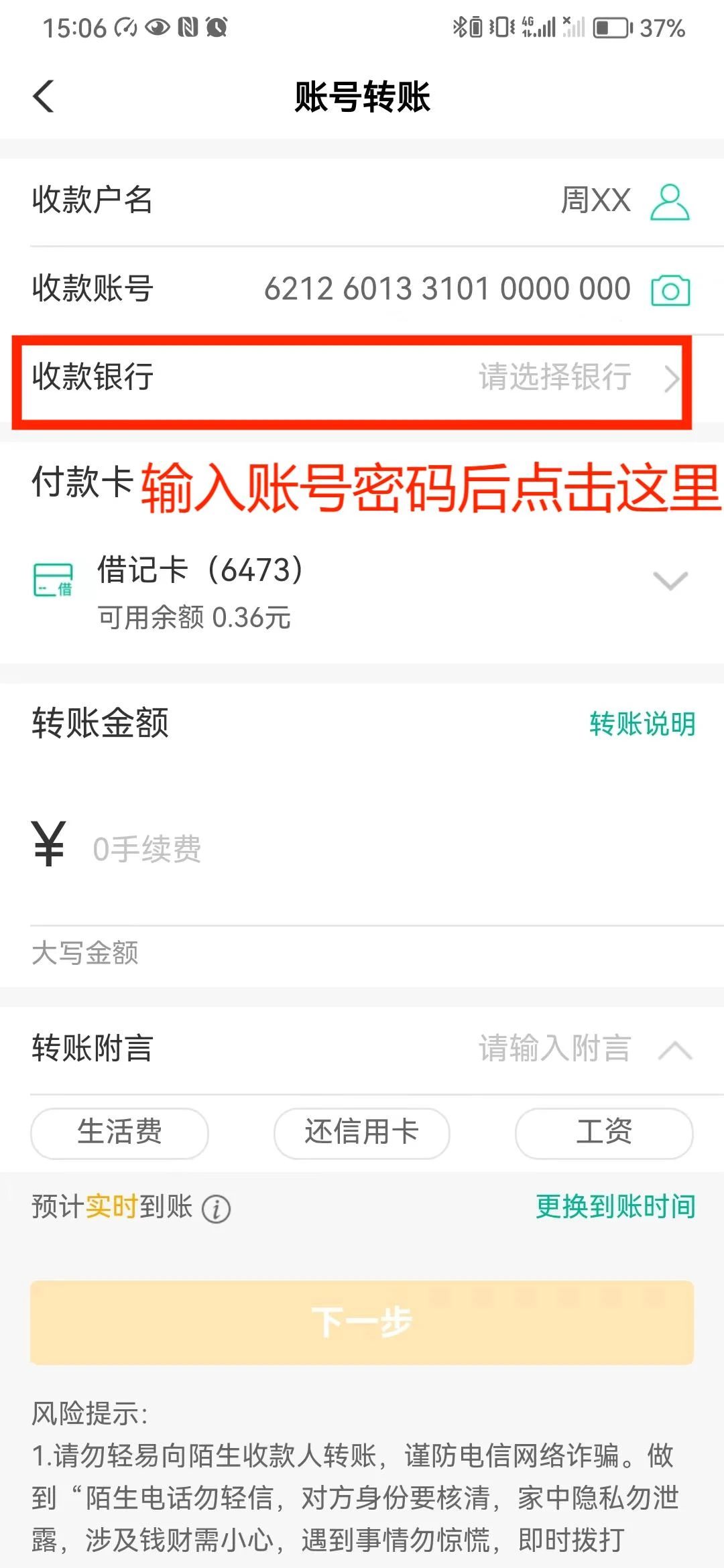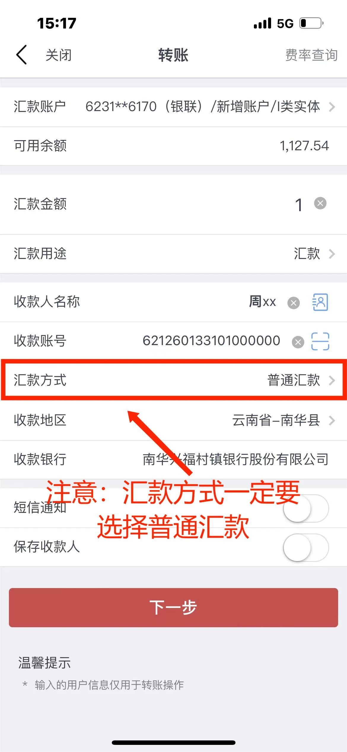 邮储银行手机银行→跨行转账→选择金额→选择到账方式→实时/普通→选择村镇银行→地区选择云南-楚雄南华-“南华兴福村镇银行股份有限公司”-输入用户名、卡号-完成转账。