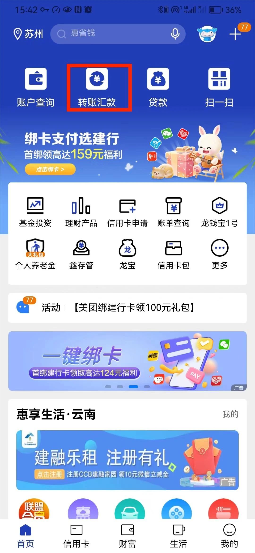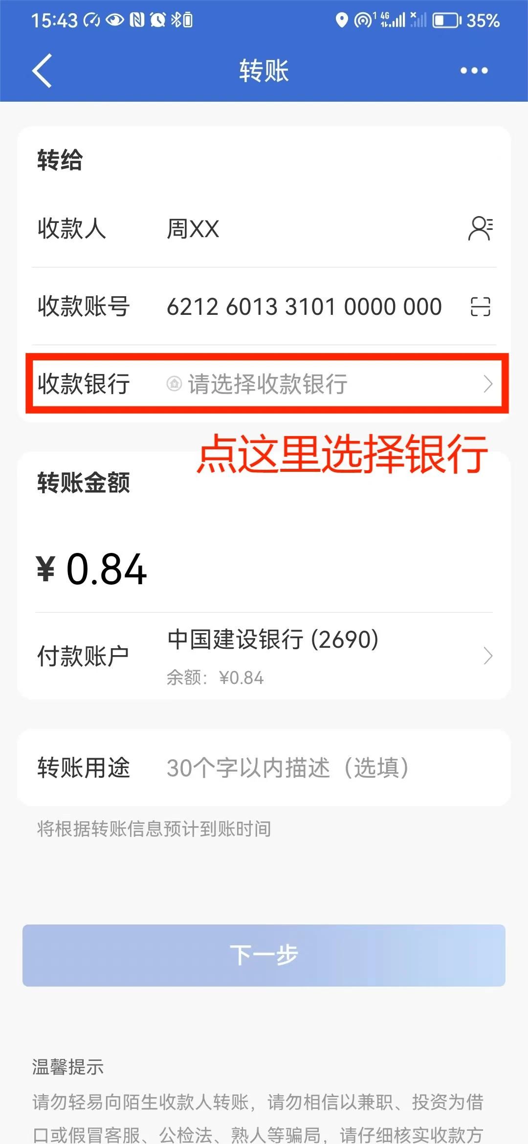建设银行手机银行→转账→填写转账信息→选择收款银行→村镇银行→选择云南省南华县→南华兴福村镇银行股份有限公司→完成转账。