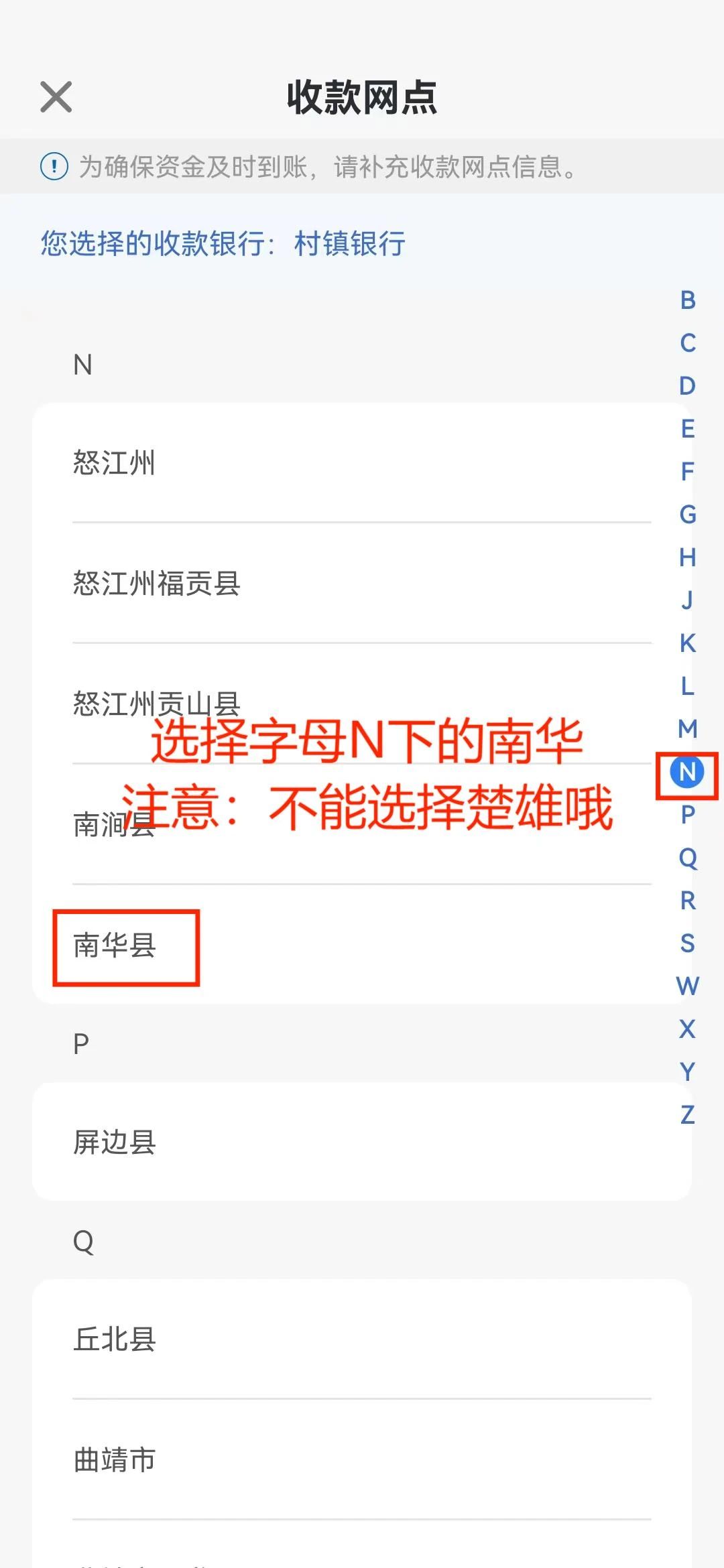 招行手机银行→转账→银行账号转账→填写您的户名及账号→选择银行→村镇银行→开户地选择点击“下一步”→收款银行选择→“开户地”→选择“云南-南华县”→“分支机构”选择“南华兴福村镇银行股份有限公司”。