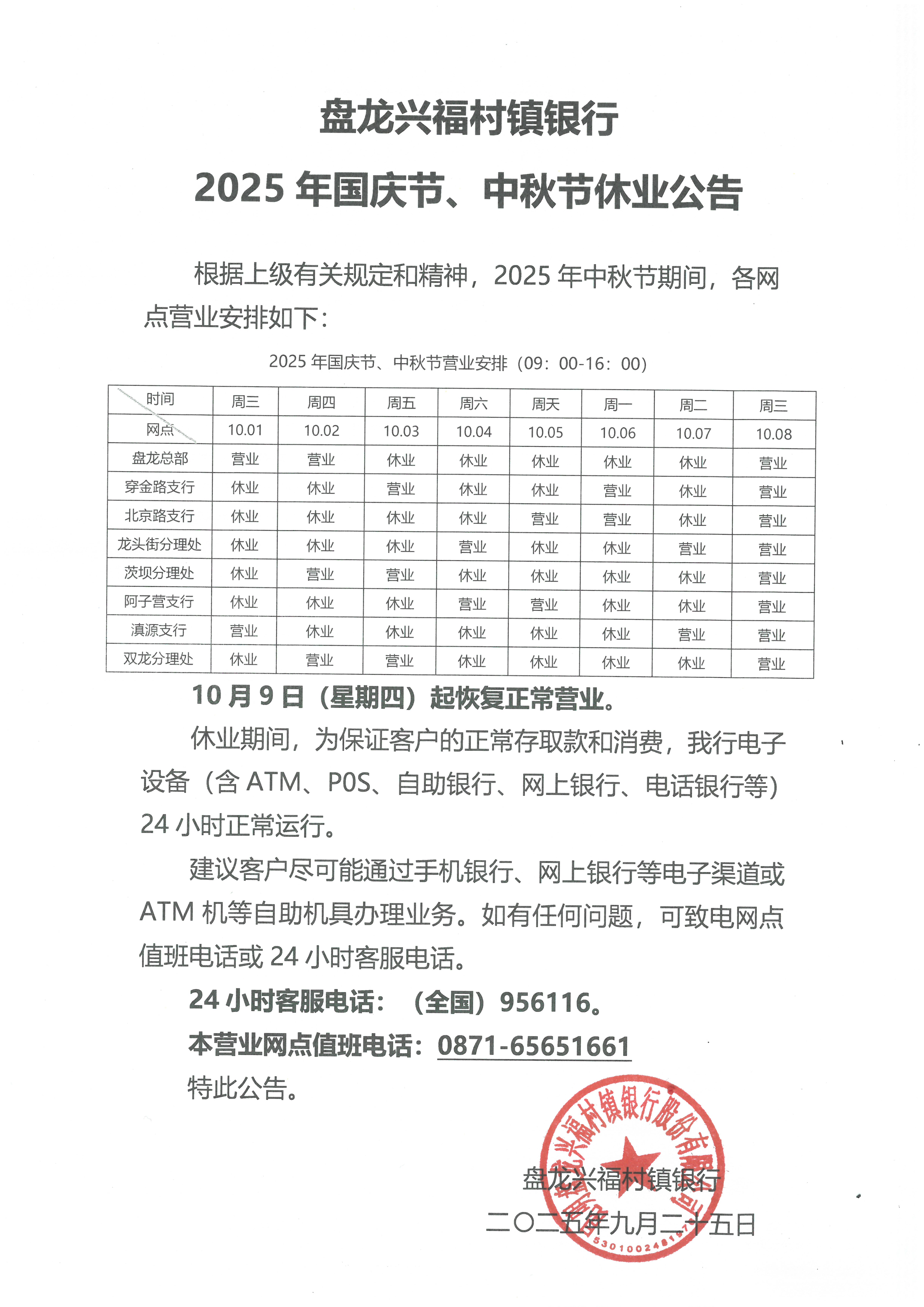 盘龙兴福村镇银行2025年国庆节、中秋节休业公告