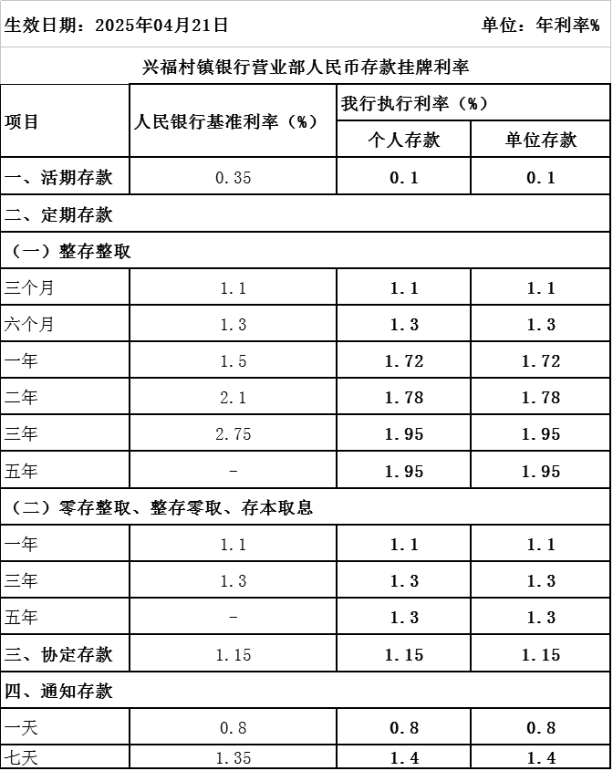 您好,兴福村镇银行营业部自2025年04月21日起,调整人民币个人和单位活期存款、定期存款挂牌利率,调整后的利率表详见下表: