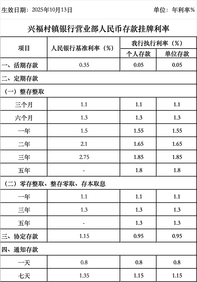 您好,兴福村镇银行营业部自2025年10月13日起,调整人民币个人和单位整存整取挂牌利率,调整后的利率表详见下表: